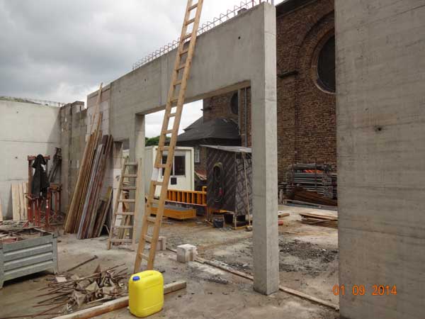 Die in der vergangenen Woche betonierten Wände werden ausgeschalt.