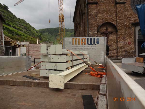 Die Deckenstützen für die Fensterfront des "Großen Saals" werden angeliefert.