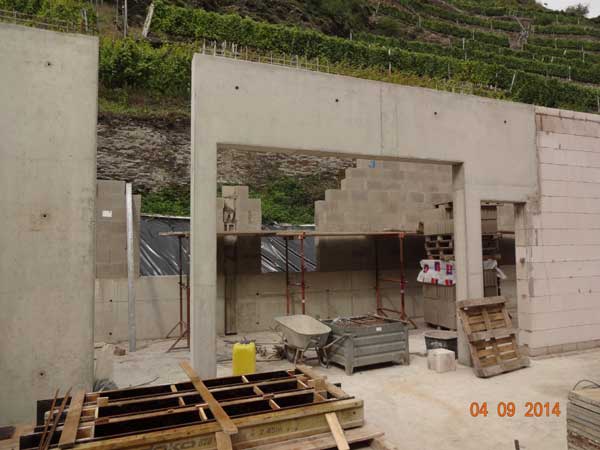Die hintere Außenwand nimmt Gestalt an. Vordergrund: Formen für die Fensterstürze.