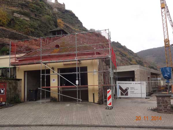 Das Fanggerüst zur Sicherung des Dachstuhlabrisses wurde aufgestellt.