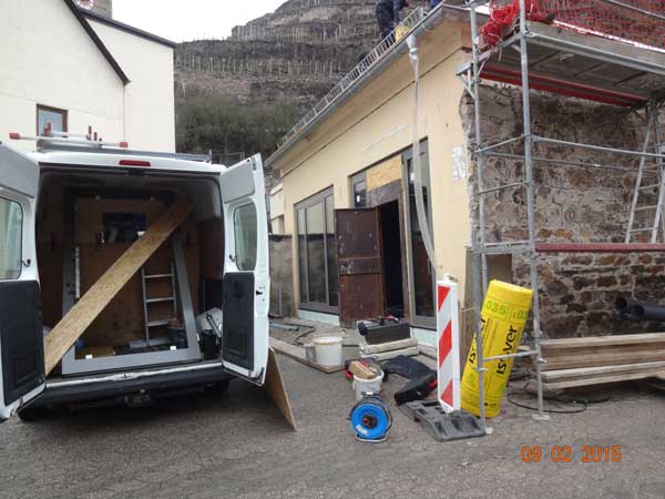 Zum Schutz der Fensterelemente wurde eine Bautür gesetzt.