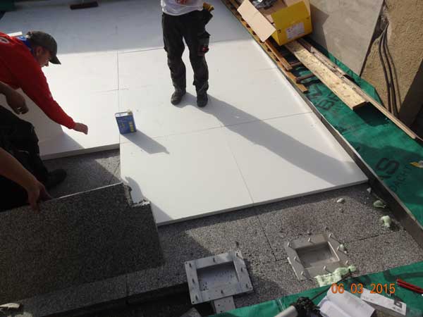 Dachaufbau: Grundplatte (grau) und Gefälleplatte (weiß), vorne Dachabläufe.