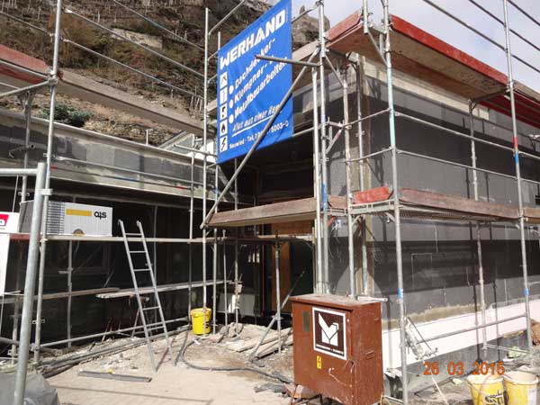 Die Außenwärmedämmung ist fast fertig montiert.