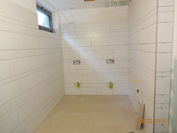 Mit der Fliesung der Wände in den Sanitärräumen wurde begonnen.