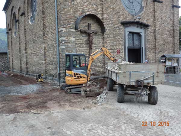 Das alte Pflaster auf dem Kirchplatz wird zur erxternen Wiederverwertung verladen.