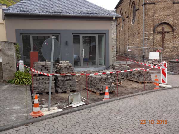 Das Pfalaster wurde zur Wiederverwertung vor Ort auf Paletten gesetzt.