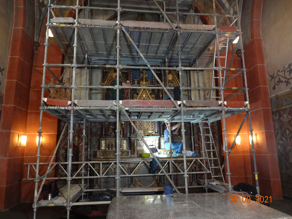 Die Reinigungsarbeiten sind im unteren Bereich des Haupaltars angekommen.
