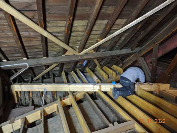 Die Elektriker arbeiten auf dem Kirchengewölbe.