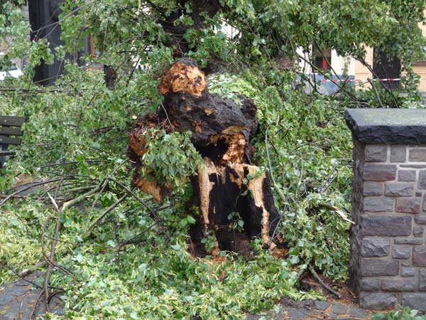 Der am Stammfuß morsche Baum hat der Windlast nicht standgehalten.